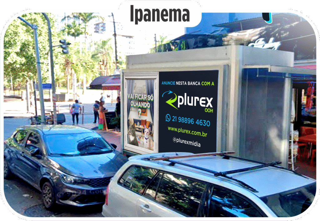 Anúncio digital ou estático em uma das faces e uma banca de jornal.